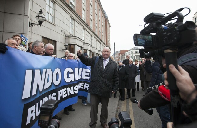 Outside, about 100 former and current Irish Independent workers, along with trade unionists and other supporters, gathered to protest INM’s decision to stop paying into a defined benefit pension scheme, which would result in roughly a 70% reduction to the pensions for former staff, many of whom are yet to reach retirement age.
