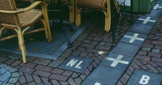 For clarification, the border has been made visible on streets with iron pins, indicating clearly whether each side is in Belgium or in the Netherlands.
