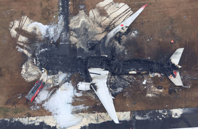 The wreckage of Japan Airlines flight 156 on the runway. The Yomiuri Shimbun via AP Images/Alamy