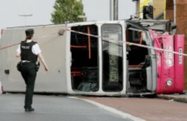 An eyewitness told the Irish News: “I was just about to cross the road and very slow-motion-style the bus hit the kerb, into the wall, and then very slowly fell over… there was a very loud bang.”