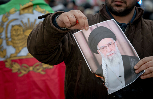A protester burns a photo of Ali Khamenei, Supreme Leader of Iran, in London. Alamy Stock Photo