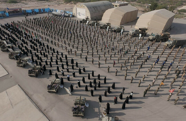 Troops standing at attention during a military drill in the Persian Gulf, southern Iran. The Islamic Revolutionary Guard Corps (IRGC) conducted a large-scale exercise in the Strait of Hormuz. These drills come in response to an increased U.S. military presence in the Middle East amidst escalating regional tensions. Alamy Stock Photo