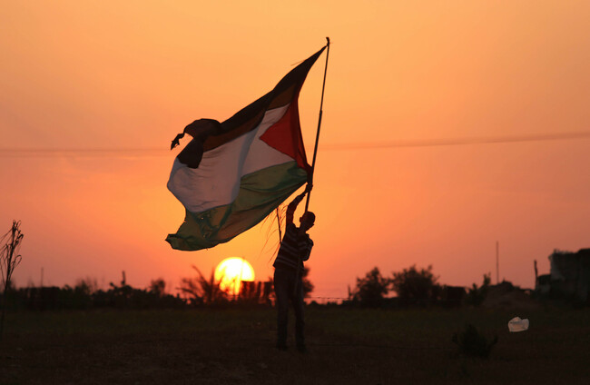 A Palestinian man waves a Palestine flag at the time if the Great March of Return in 2018. Alamy Stock Photo