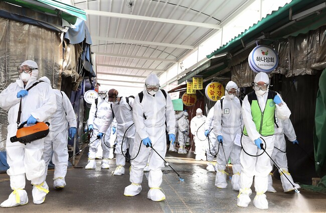 Workers wearing protective suits spraying disinfectant in Seoul, South Korea. Lee Jong-Chul AP/PA Images