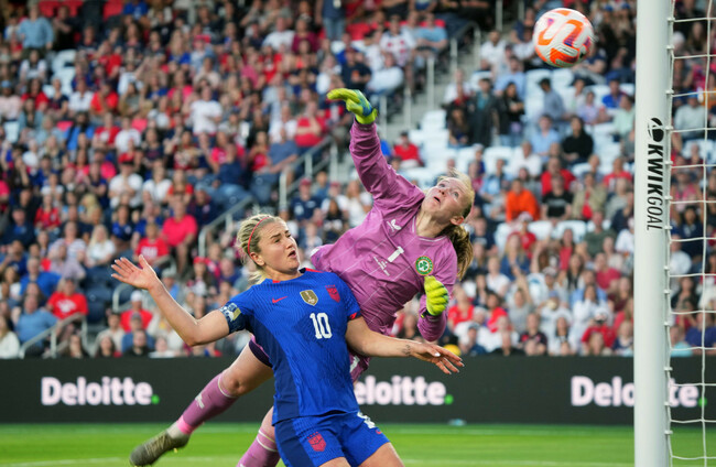 Lindsey Horan watches Ireland goalkeeper Courtney Brosnan reach for Alana Cook's effort. Alamy Stock Photo