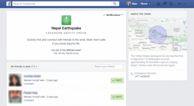 IN THE AFTERMATH of the two earthquakes in Nepal, Facebook set up a safety check function to allow users caught up in the tragedy to alert their family and friends to their safety with a quick status update.