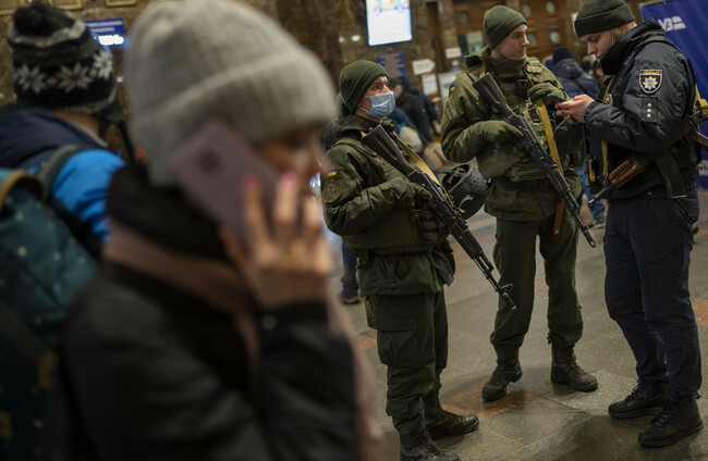 Ukrainian soldiers stand guard as people try to leave at the Kyiv train station. Emilio Morenatti