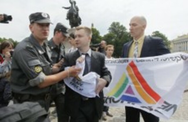 Police interrupt a gay rights protest in St Petersburg in June 2011. AP Photo/Dmitry Lovetsky/PA Image