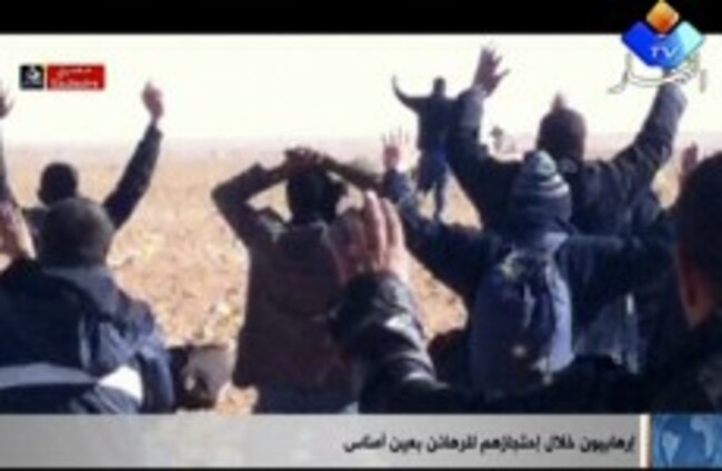 In this image made from video, a group of people believed to be hostages kneel in the sand with their hands in the air at an unknown location in Algeria. AP Photo/Ennahar TV