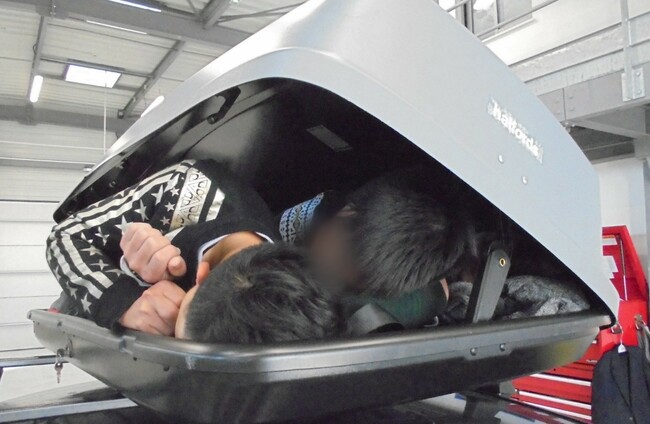 Pictures released by the UK interior ministry showed the three individuals – who included a 15-year-old girl – being helped out of the white container box strapped to the top of the man’s black sedan.