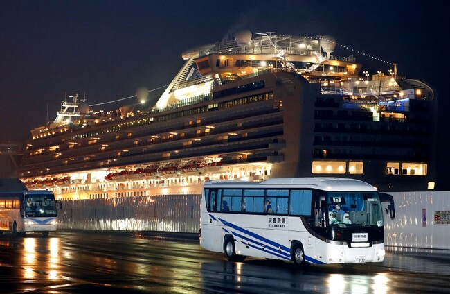 Buses carrying US passengers off the quarantined Diamond Princess cruise ship. 平田潤