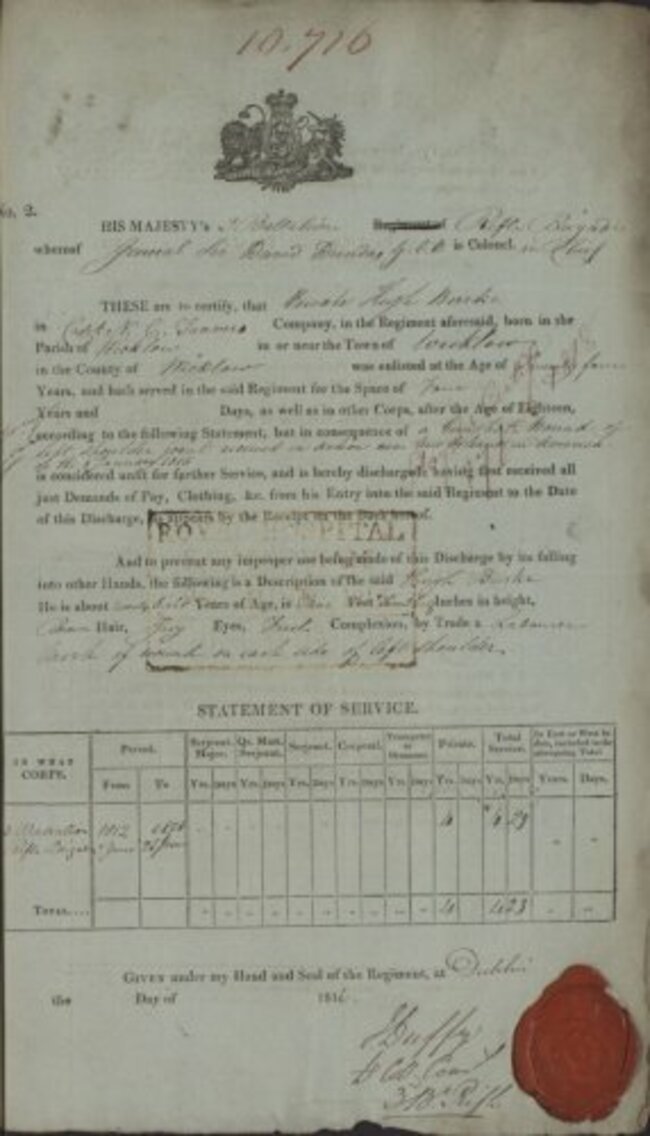 Among the records are those of Private Hugh Burke from Wicklow, who was pensioned from the army on 26 June 1816 after four years’ service. He was deemed unfit for further service after: