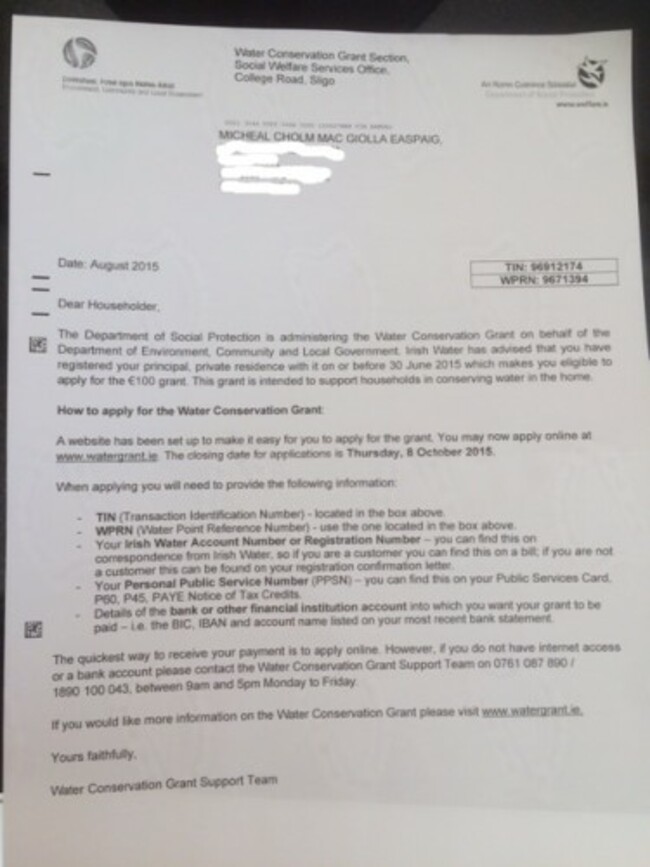 Micheál Mac Giolla Easbuig only became aware of the error when he received a letter this week from the Department of Social Protection informing him he is eligible for the €100 water conservation grant as he registered with Irish Water before the deadline.