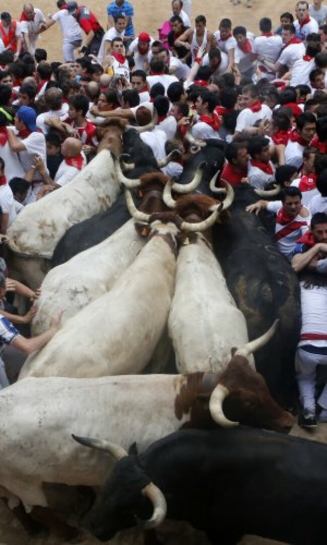 Television pictures showed a pile of runners, in traditional white shirts and red neckerchiefs, blocking the entrance to a bullring, the end point of the frantic dash through the town’s cobbled streets.