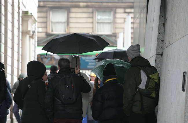 A group of tourists with umbrellas listen to a tour guide near Dame Street during a period of wet overcast rainfall earlier this month. Brendan Donnelly via Alamy