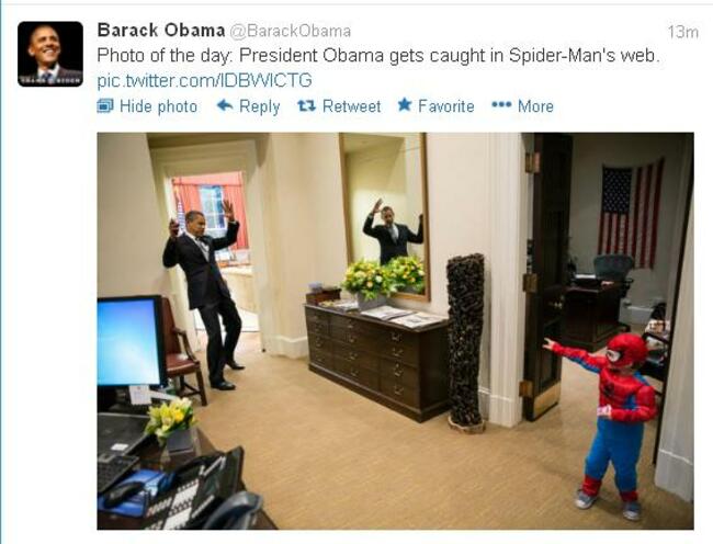 He might be President of the United States but he can’t resist Spider-Man’s web.