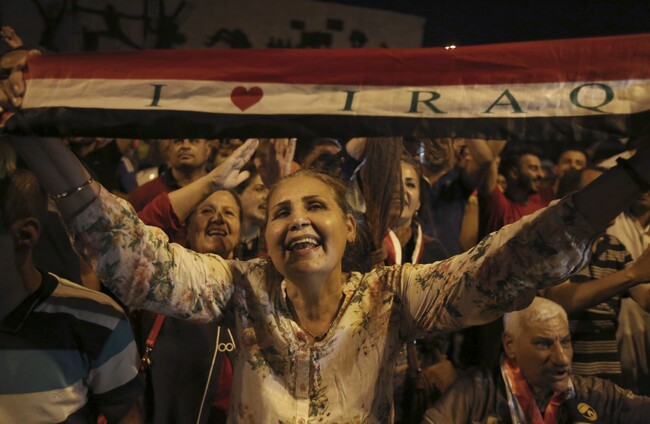 Iraqis celebrate in Tahrir square while holding national flags as they wait for the final announcement of the defeat of the Islamic state militants. Karim Kadim/AP