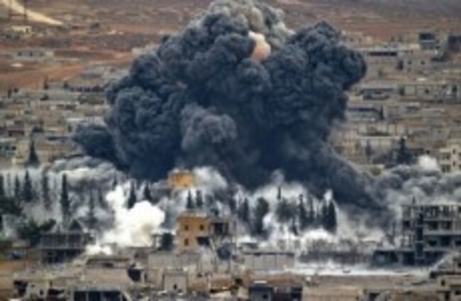 COALITION WARPLANES POUNDED a stronghold of the Islamic State group in Syria today amid uncertainty over the fate of a US hostage the jihadists claim was killed in an earlier raid.