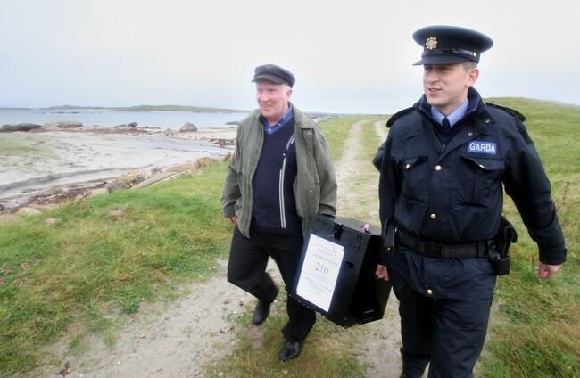 Electoral officer, Hugh O'Donnell with Garda Brendan McCann, carry the ballot box, for the Lisbon Treaty voting, on Inishfree Island off the coast of Co Donegal. PA Archive/PA Images