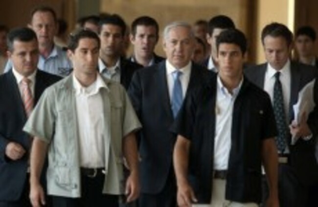 Israeli Prime Minister Benhamin Netanyahu, centre, photographed yesterday with his bodyguards. AP Photo/Sebastian Scheiner