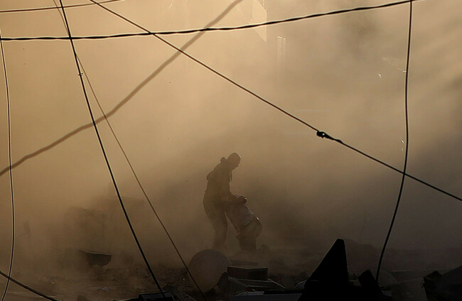 Footage posted online from the site of the strike showed a body hanging over a street from part of a destroyed building and people rushing casualties to hospital.