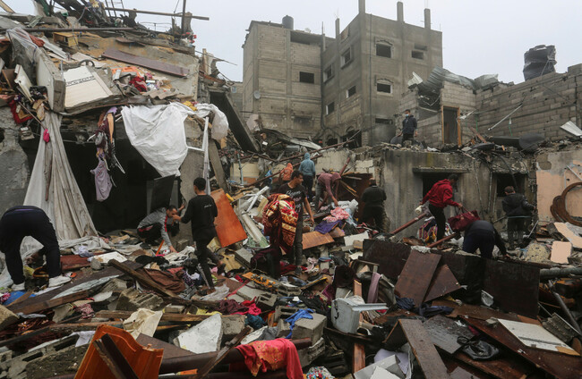 Palestinians salvage their belongings after an Israeli strike in Rafah, Gaza Strip Alamy Stock Photo