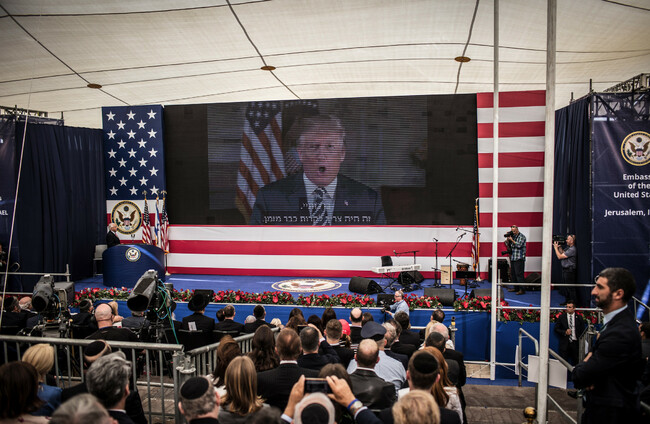 A speech of US President Donald Trump is televised during the opening ceremony of the new US embassy in Jerusalem. Ilia Yefimovich/DPA/PA Images