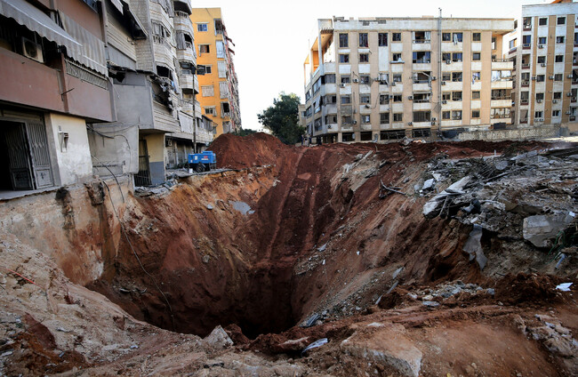 A huge crater is seen at the site of the massive Israeli air strike that killed pro-Iranian Hezbollah chief Hassan Nasrallah in Beirut's southern suburb. Marwan Naamani/dpa/Alamy Live News