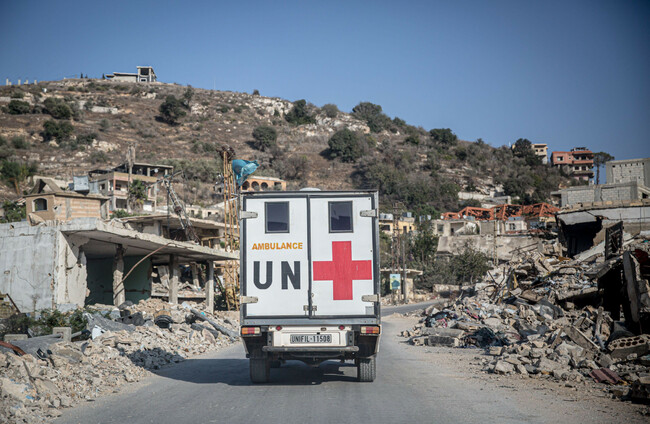 UN ambulance drives through ruins of a southern Lebanese village on 27 November Alamy Stock Photo