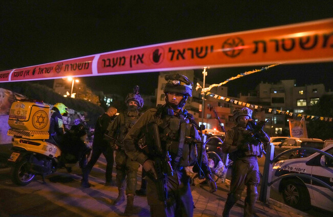 Israeli forces secure the area near a stabbing attack in the town of Elad. Maya Alleruzzo/AP