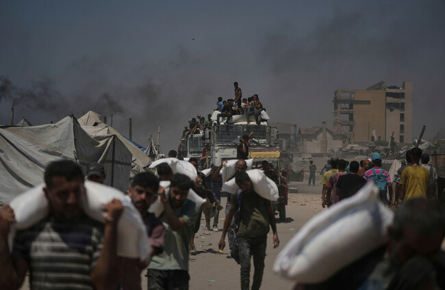 Palestinians carry sacks of flour unloaded from a humanitarian aid convoy that reached Gaza City. Alamy Stock Photo