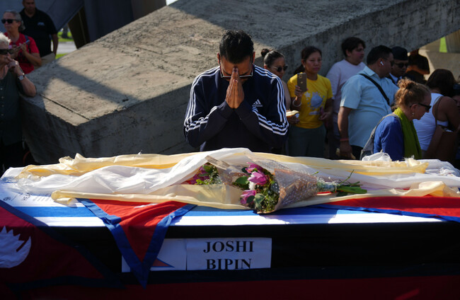 Relatives and friends of Nepali national Bipin Joshi, who was taken hostage by Hamas into Gaza, mourn next to his coffin during a farewell ceremony before his body is flown to Nepal for burial, at Ben Gurion airport in Lod, Israel. Alamy Stock Photo
