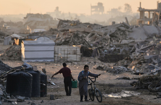 Palestinians walk through the destruction caused by the Israeli air and ground offensive in Sheikh Radwan neighbourhood in Gaza City on Wednesday. Alamy Stock Photo