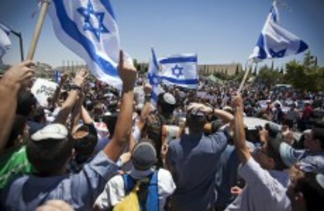Jewish settlers wave Israeli flags during a protest against the decision to evacuate a West Bank outpost in the Ulpana neighbourhood. Oded Balilty/AP/Press Association Images