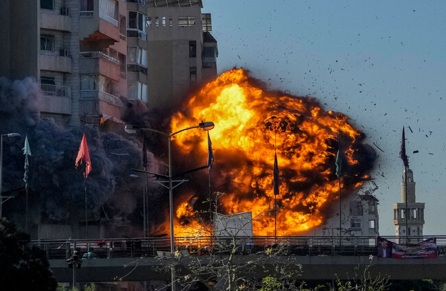 Thick smoke and flames erupt from an Israeli airstrike on Tayouneh, Beirut, today Alamy Stock Photo