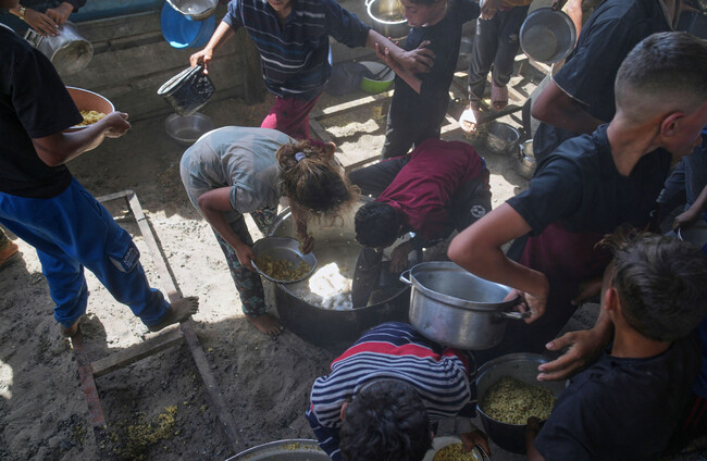 Palestinian children scrape a pot for leftover food after all meals were distributed at a community kitchen in Khan Younis, southern Gaza Strip, on Friday. Alamy Stock Photo
