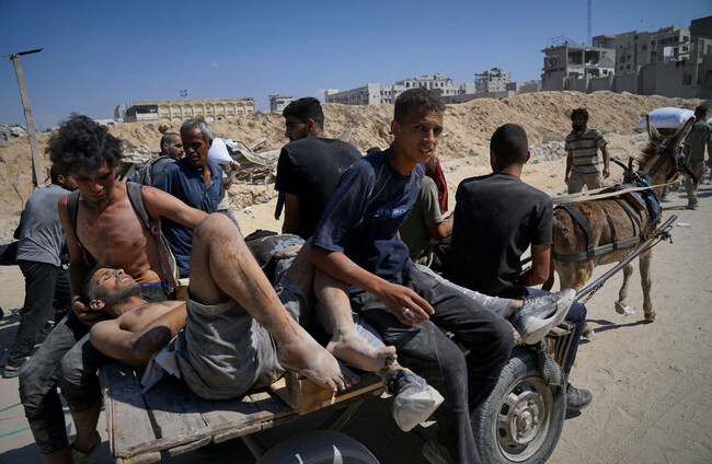 Palestinians yesterday are carried after being wounded while trying to reach trucks carrying humanitarian aid en route to Gaza City, in the outskirts of Beit Lahiya, northern Gaza Strip. Alamy Stock Photo