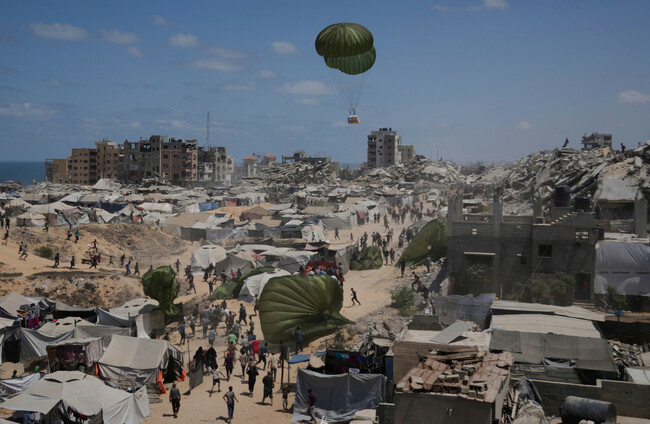 Palestinians rush to collect humanitarian aid airdropped by parachutes into Gaza City Alamy Stock Photo