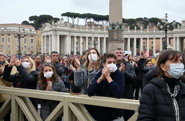 Pilgrims arrive in St. Peter's Square for the Angelus prayer with masks to protect themselves from the coronasvirus SIPA USA/PA Images