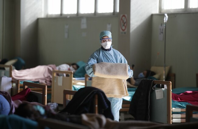 Medical staff work at one of the emergency structures that were set up to ease procedures at the Brescia hospital, northern Italy. Luca Bruno/PA