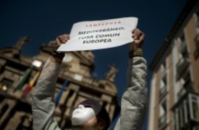 A demonstrator holds up a banner which reads, "Lampedusa, Mediterranean Sea, Communal Grave", during a protest against European immigration policy in Pamplona, AP Photo/Alvaro Barrientos