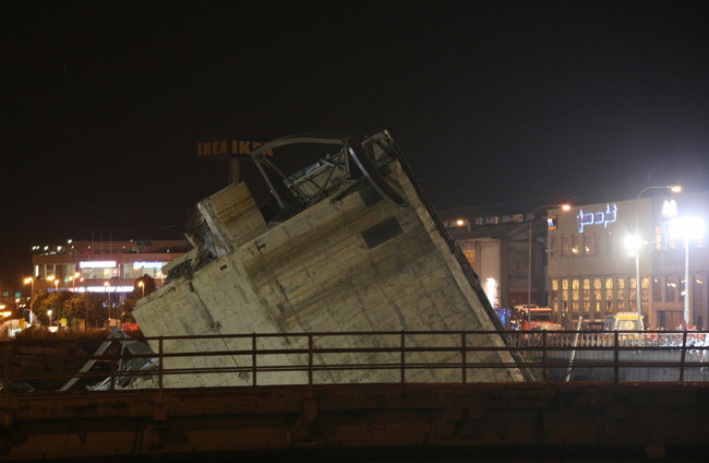 A vast span of the Morandi bridge caved in during a heavy rainstorm in the northern port city yesterday, sending about 35 cars and several trucks plunging 45 metres onto the railway tracks below.