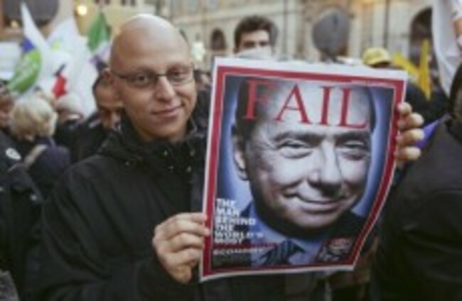 A man, waiting for the resignation of Berlusconi, shows a mock magazine cover displaying the former PM in Rome. Riccardo De Luca/AP/Press Association Images