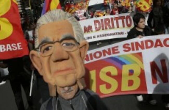 Watched by a heavy police presence, some demonstrators wore giant masks of Prime Minister Mario Monti or the devil, while others carried red banners and puppets of former premier Silvio Berlusconi, German Chancellor Angela Merkel and US President Barack Obama.