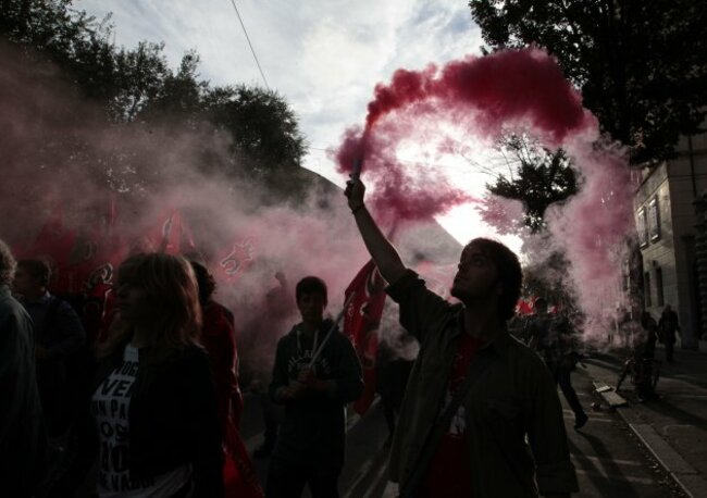 Protesters march during a demonstration against Italian Premier Mario Monti’s austerity measures, in Rome, Saturday, Oct. 27, 2012. On Saturday, Italians in several cities took to the streets for a “No Monti” day of protests. Monti had initially said he wouldn’t run in spring elections, but recently hinted that he could stay on for a second term under the right circumstances. (AP Photo/Gregorio Borgia)