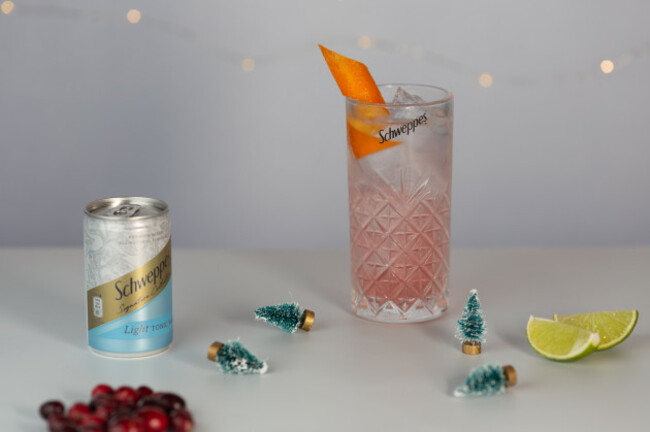 Fill a hurricane glass with ice. Add the vodka, triple sec, lime juice and cranberry juice. Stir hard and top up with Schweppes Signature Light Tonic Water. To garnish cut the peel of an orange – then for extra festive points, top, tail, taper and twist it into the glass.