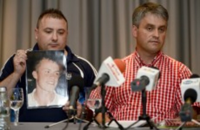 James Nolan's brother-in-law Gareth Dudley and uncle Pat Nolan speak to reporters in Bydgoszcz last night. Roman Bosiacki/AP