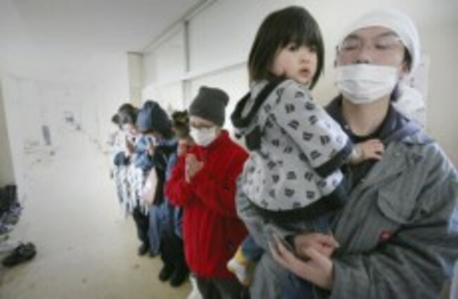 Survivors pray for victims at an evacuation center in the devastated city of Sendai, northeastern Japan, on Friday, March 18, 2011. Tadashi Okubo/AP/Press Association Images