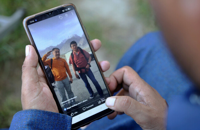 Pakistani guide Muhammad Ibrahim shows a picture of Japanese climbers Semba Takayasu with Shinji Tamura MH Balti/PA Images