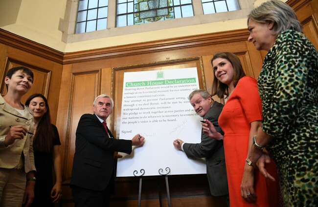 In a display of unity, leaders and MPs from a range of parties – bar the Conservatives – came together to agree a strategy against a no-deal Brexit and to form an alternative parliament if UK Prime Minister Boris Johnson does try and prorogue parliament.